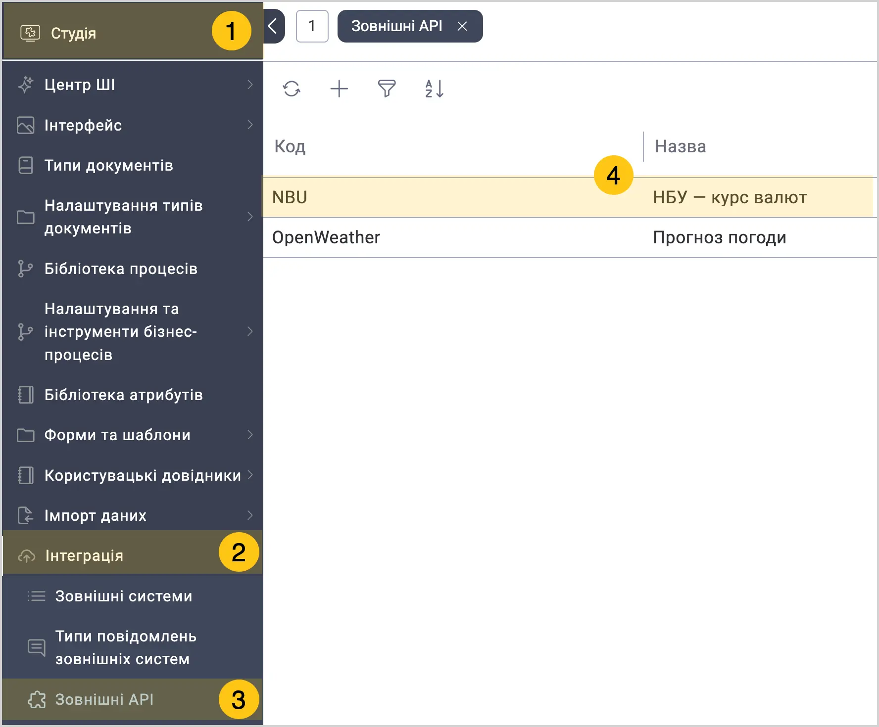 Виберіть групу ярликів Інтеграція 2, а потім виберіть ярлик Зовнішні API 3.