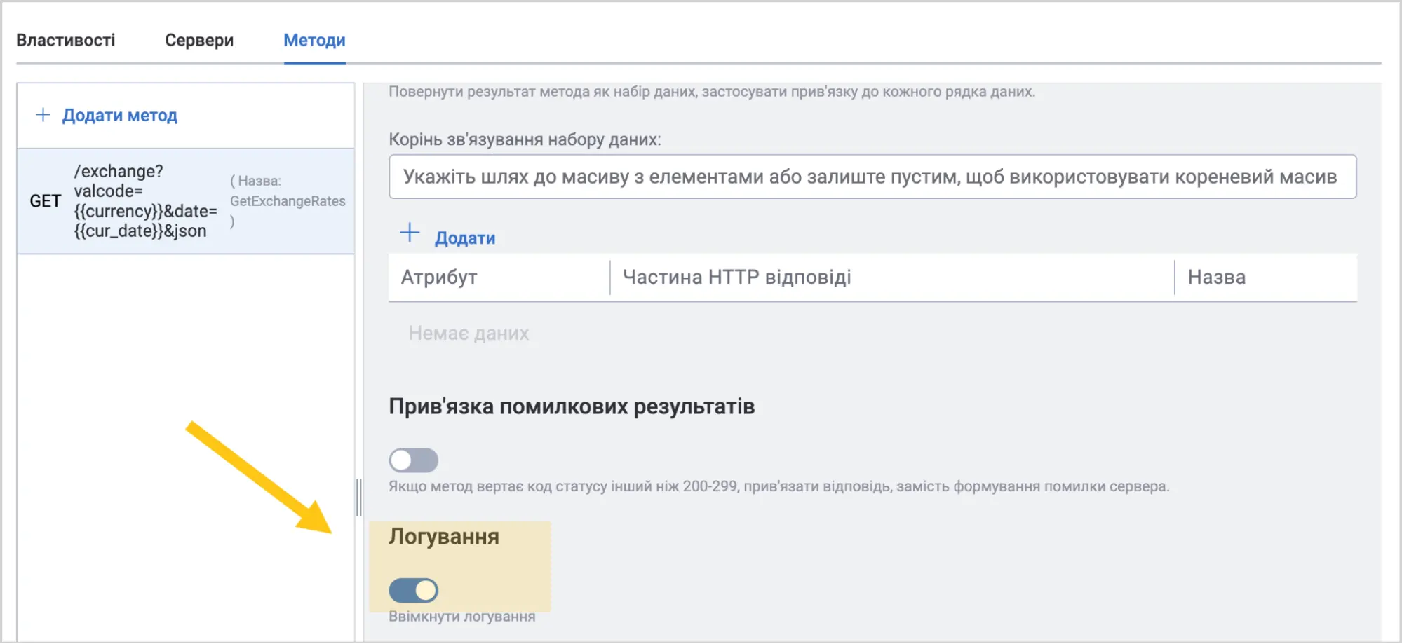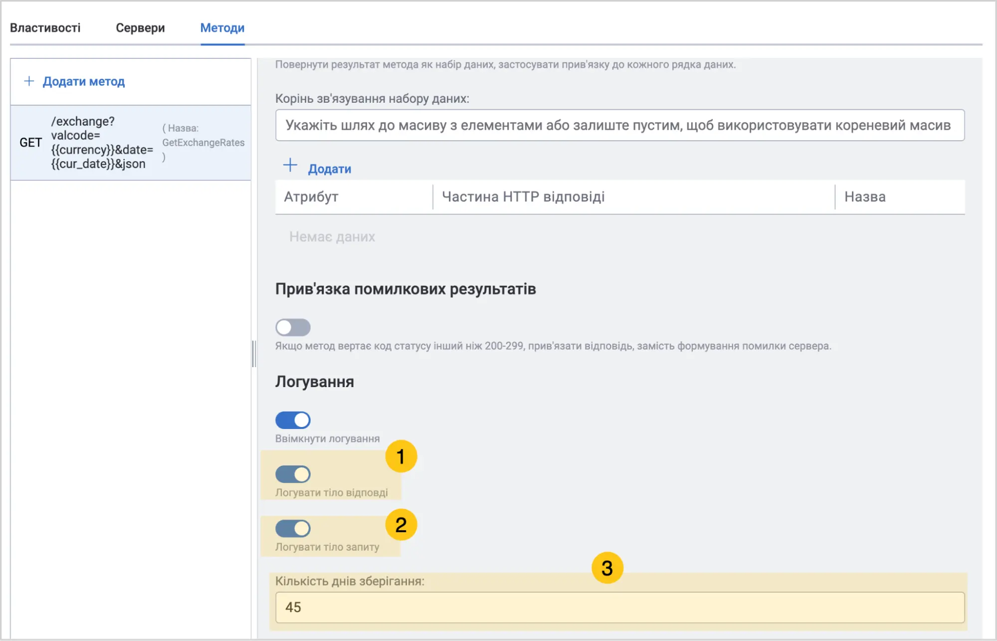За потреби, увімкніть перемикачі Логувати тіло відповіді 1 та Логувати тіло запиту 2.