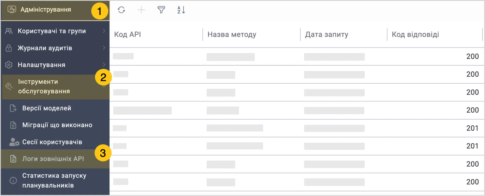 Виберіть групу ярликів Інструменти обслуговування 2, а потім виберіть ярлик Логи зовнішніх API 3.