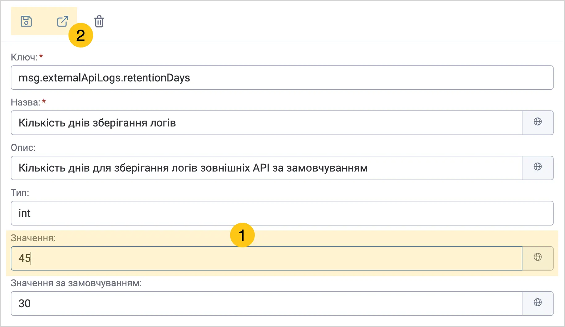 Для зміни налаштувань необхідно відкрити потрібний ключ (в полях назва та опис наведена інформація призначення ключа) та змінити значення. В разі використанні на оточені декількох локалізацій, є можливість встановити різні значення ключа налаштувань для різних локалізацій.