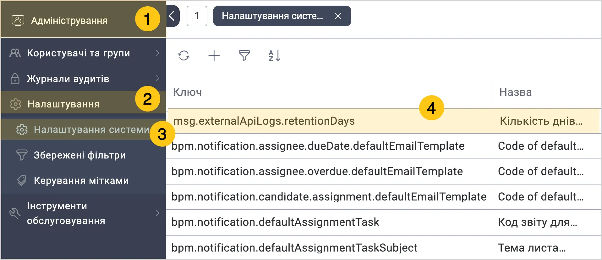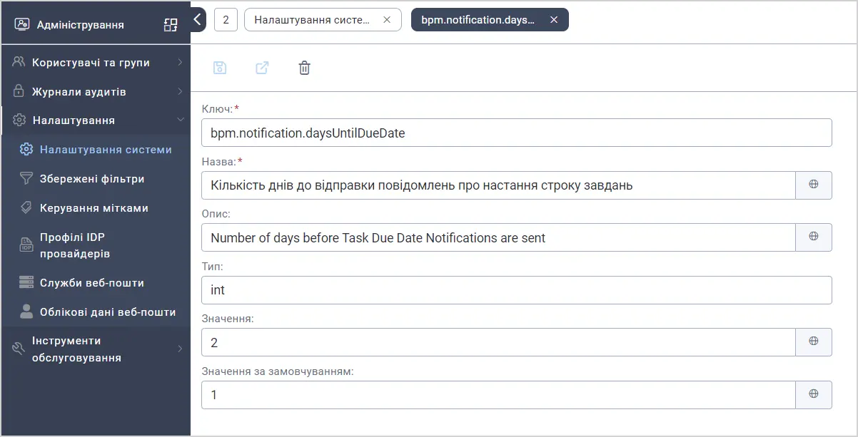 | bpm.notification.daysUntilDueDate | Кількість днів до відправки повідомлень про настання строку завдань | int | 1 |