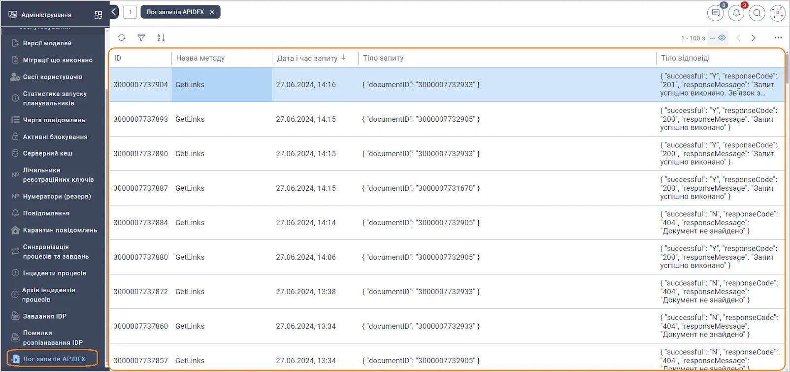 Для відкриття журналу необхідно відкрити робочий стіл Адміністрування, папку Інструменти обслуговування та ярлик Лог запитів APIDFX. Буде відображено реєстр викликів.